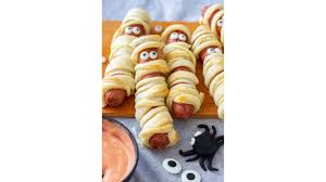 Bereiding: wikkel hotdogs in dunne strookjes bladerdeeg zodat je mummie-achtig patroon krijgt. Bak volgens de deeginstructies. Bevestig twee kleine drupjes mosterd/ketchup als ogen.